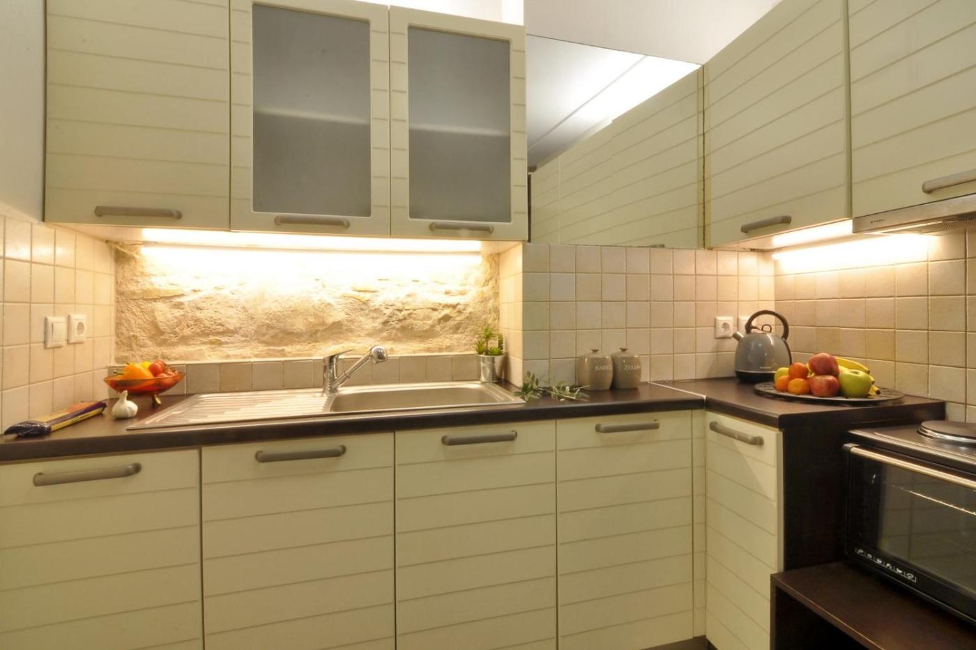 One-Bedroom Apartment. Boasting a private entrance, this air-conditioned apartment includes 1 living room, 1 separate bedroom and 1 bathroom with a shower and a hairdryer. In the well-equipped kitchen, guests will find a stovetop, a refrigerator, kitchenware and an oven. The apartment has tiled floors, a seating area with a flat-screen TV, soundproof walls, a coffee machine, as well as a dining area. The unit has 2 beds.